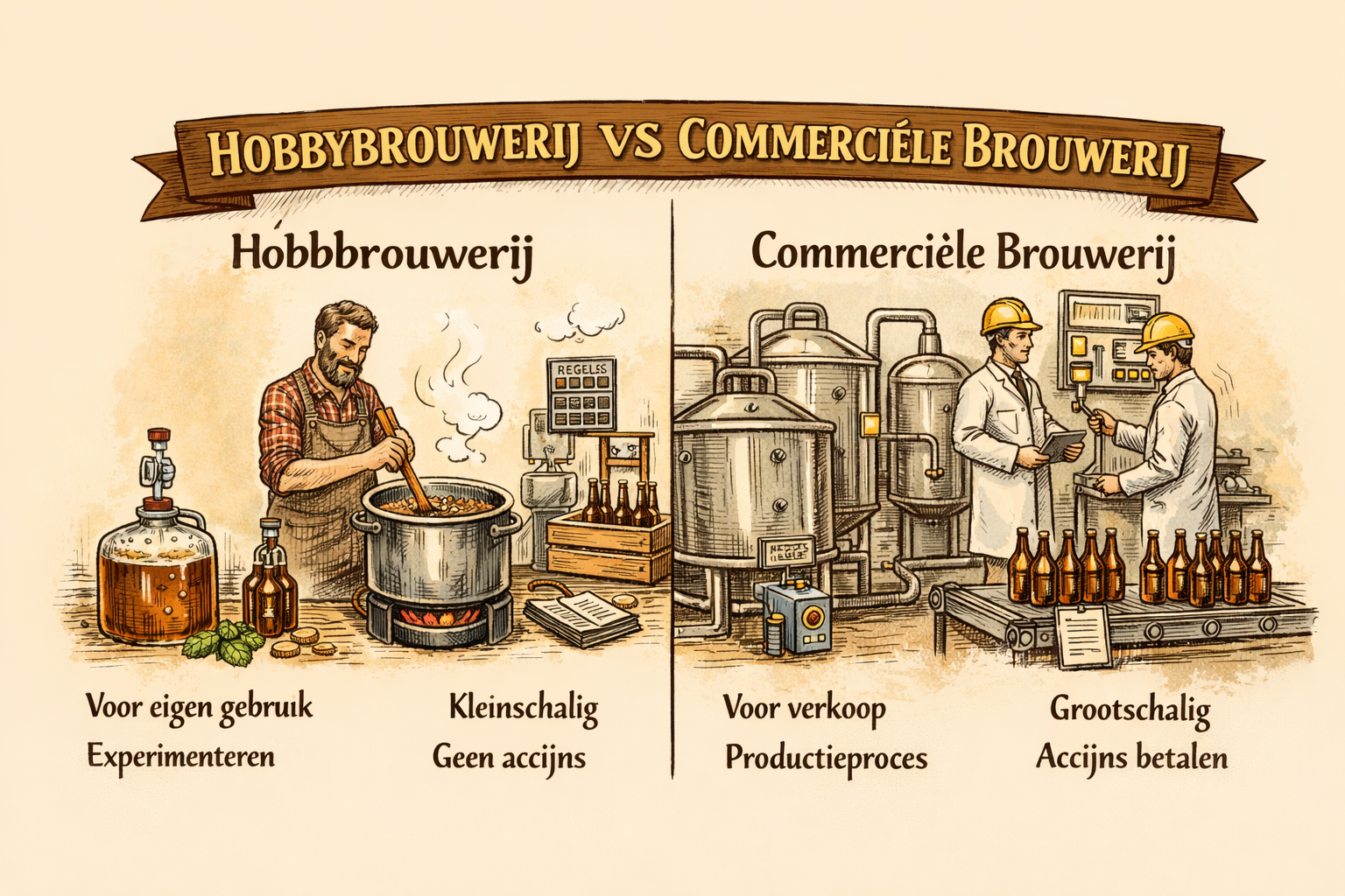 Een commerciële brouwerij produceert bier voor verkoop en distributie. Hierbij gelden wettelijke regels, accijnsverplichtingen en kwaliteitscontroles. Een hobbybrouwerij brouwt op kleine schaal, meestal in hoeveelheden van enkele tientallen liters per batch. Het doel is leren, experimenteren en genieten van het proces.